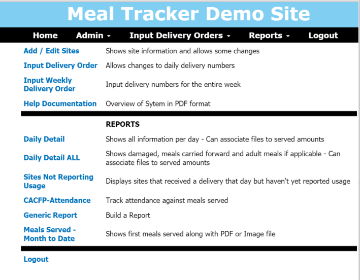 - Browser based page for sites to access past meal count forms and for sites who are not using the app to report usage